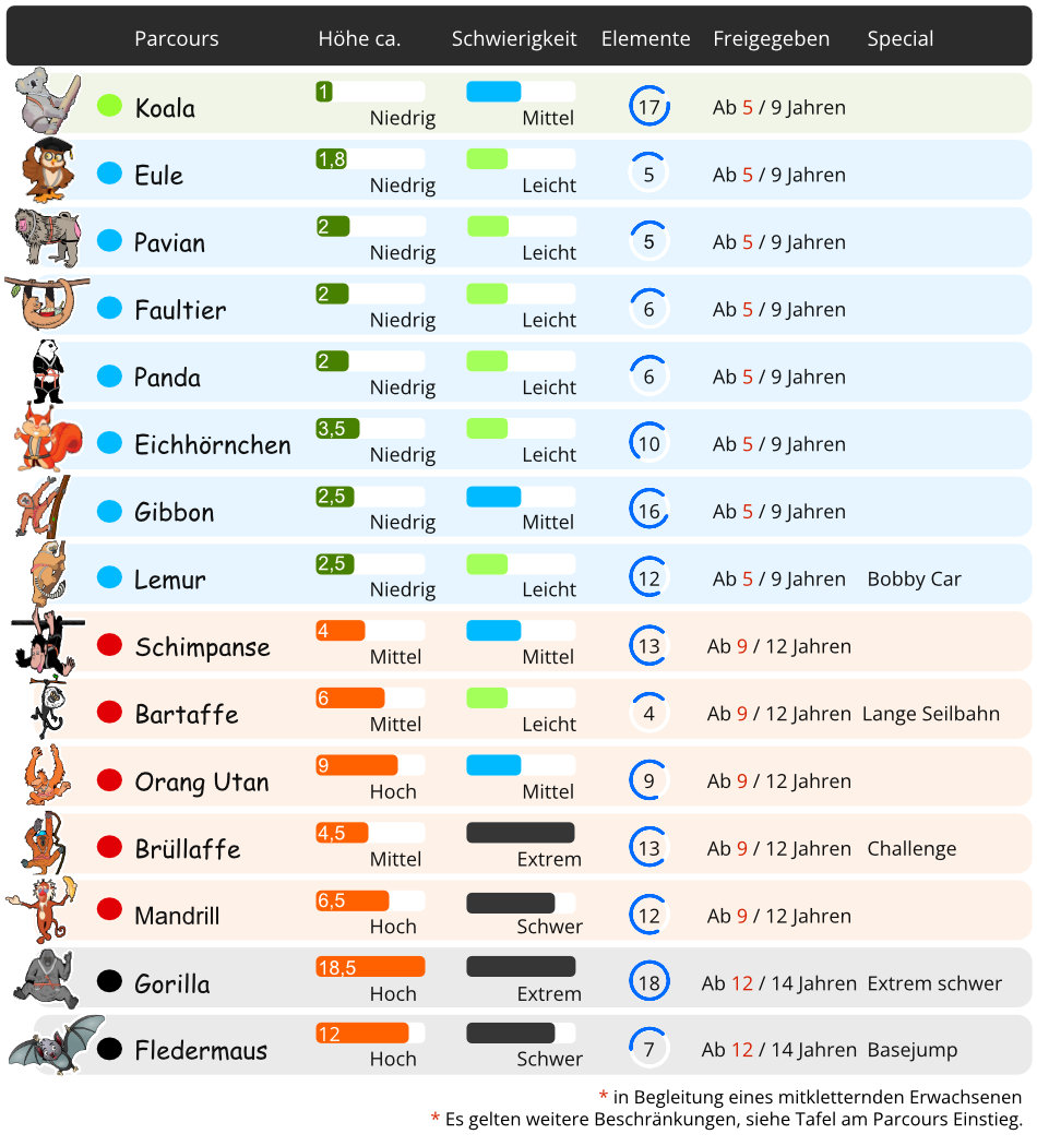 WAS ERWARTET EUCH BEI UNS ? Auf über 150 Kletterelementen in 15 Parcours gibt es Abenteuer, Action und Spaß für die ganze Familie. Testet euren Mut und eure Geschicklichkeit. Schwingt am Tarzanseil, balanciert über wackelige Brücken, fliegt an Seilen mit bis zu 120 Metern Länge durch den Wald Es geht immer von Baum zu Baum in einer Höhe von 1 bis 17 Metern und dabei können verschiedene Parcours mit unterschiedlichen Schwierigkeitsgraden bewältigt werden.