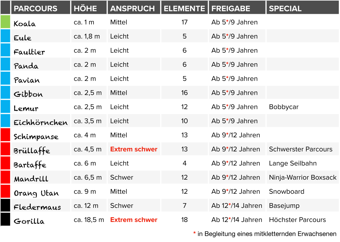 Auf über 150 Kletterelementen in 15 Parcours gibt es Abenteuer, Action und Spaß für die ganze Familie. Testet euren Mut und eure Geschicklichkeit, schwingt am Tarzanseil, balanciert über wackelige Brücken und fliegt an Seilen mit bis zu 120 Metern Länge durch den Wald!